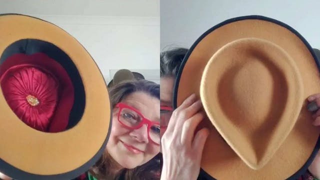The live discussion, explores hat cleaning techniques, construction methods, material choices like spring wire, lining preferences for felt hats, and current fashion trends.